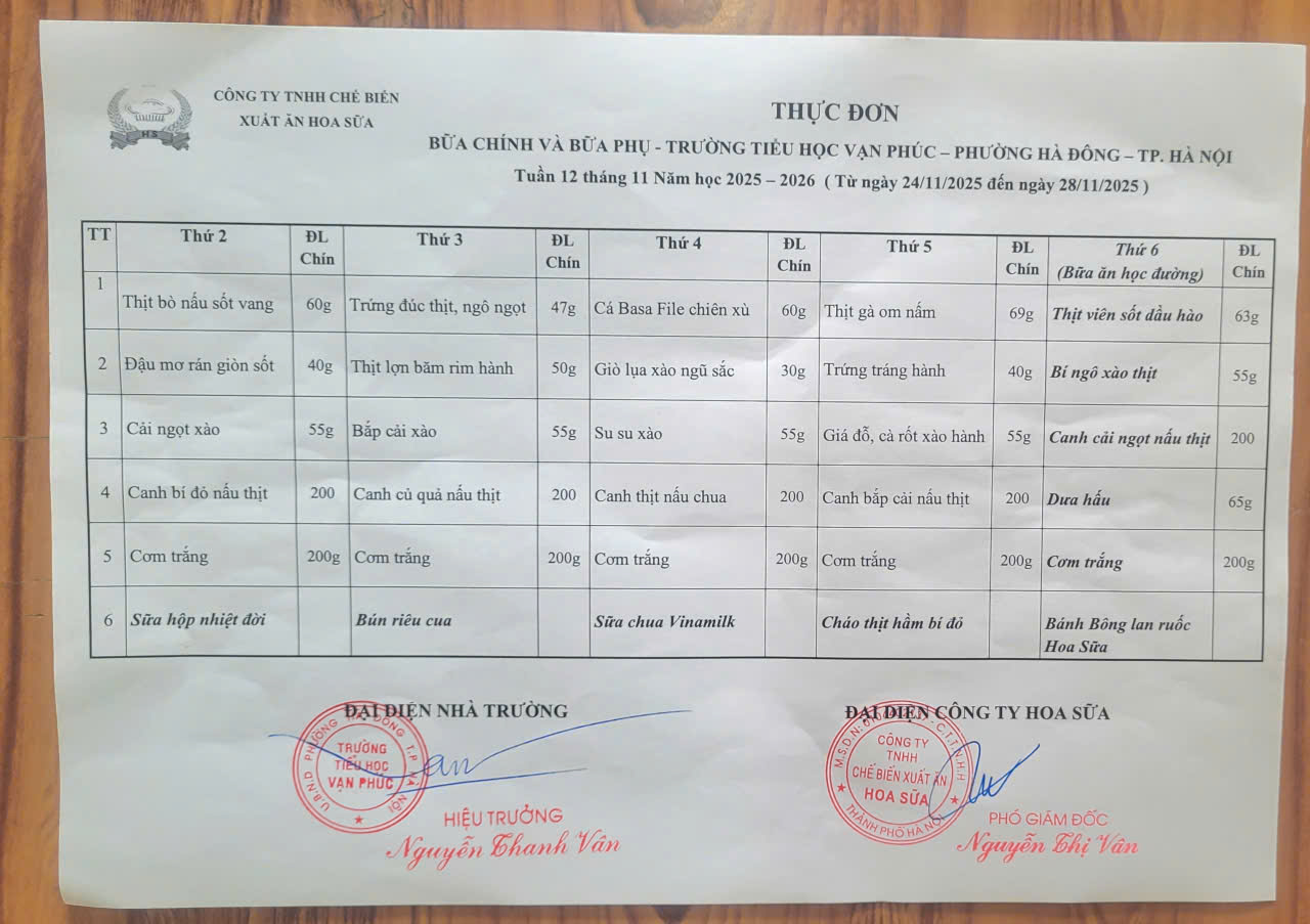 Nhà trường gửi thực đơn tuần 12 đến phụ huynh học sinh từ ngày 24/11/2025-28/11/2025