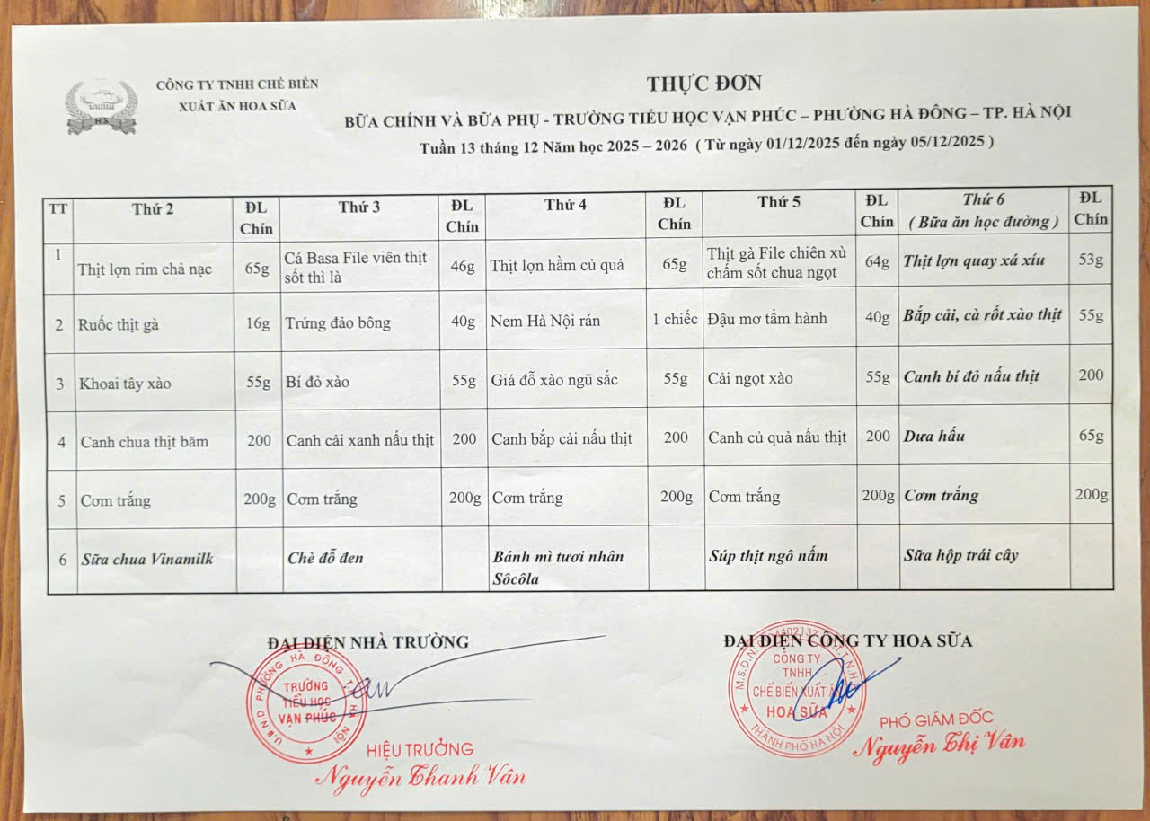 Nhà trường xin gửi đến phụ huynh học sinh thực đơn tuần 13 (từ 1/12/2025-5/12/2025)