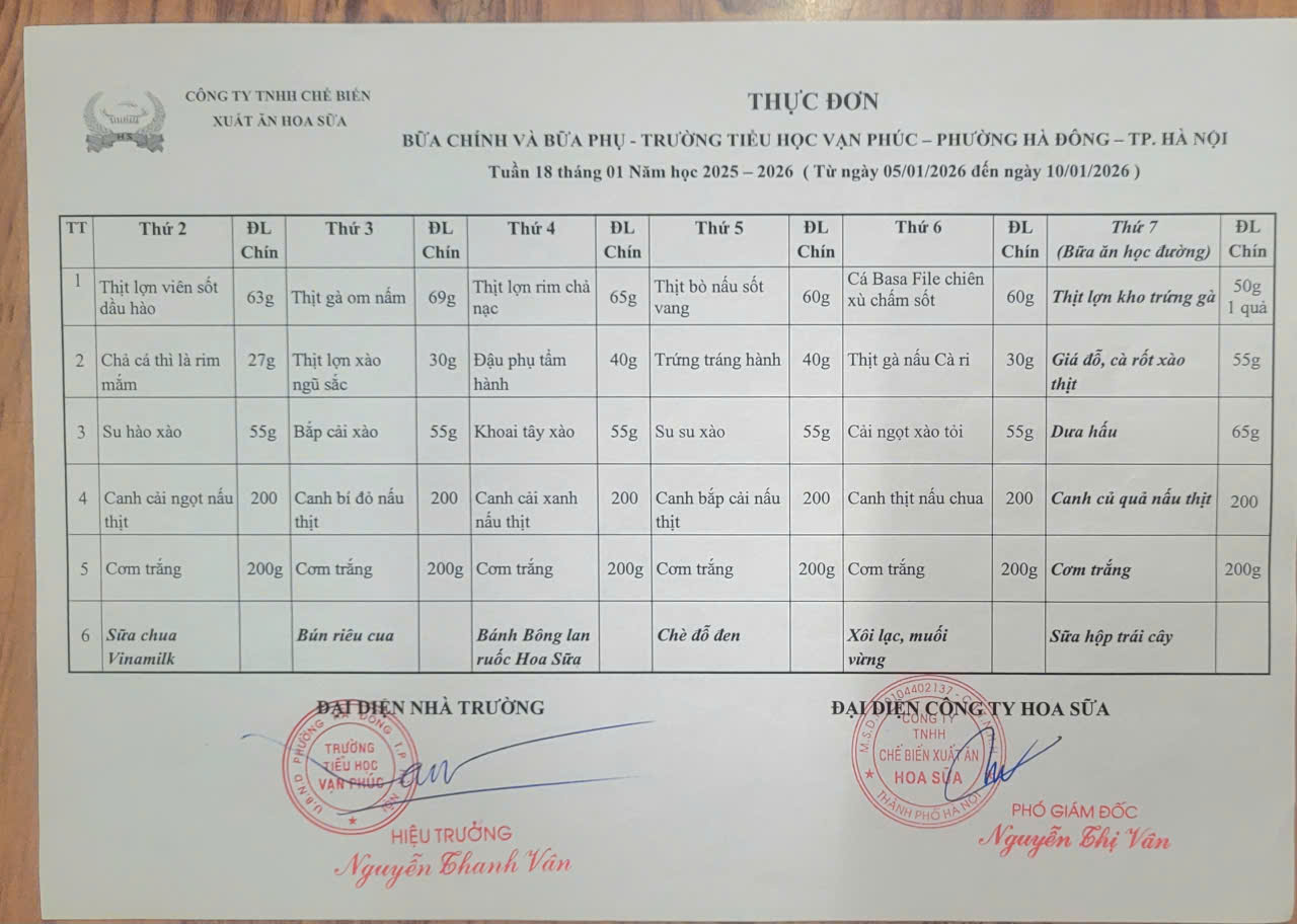 Nhà trường xin gửi thực đơn bán trú tuần 18 (5/1/2026-9/1/2026)